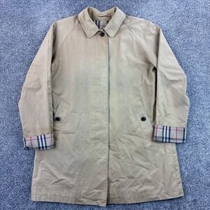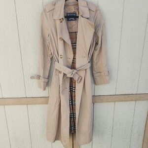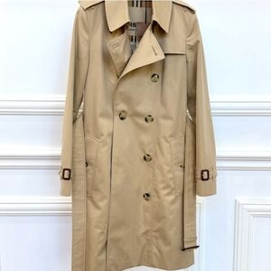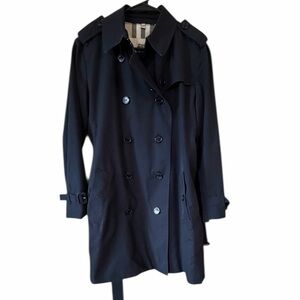 Elegant black quilted trench coat by Burberry. Features classic button closure and signature lining. Ideal for versatile styling.