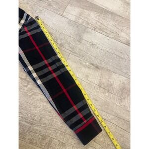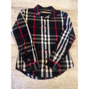Elegant checkered pattern. Features black, red, and white. Button-down design. Timeless Burberry style.