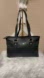 Chic black leather shoulder bag with textured finish. Features dual handles and subtle logo detail.