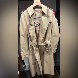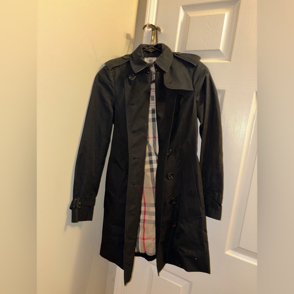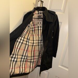 Classic black trench coat. Features iconic Burberry lining. Double-breasted with button closure. Stylish and timeless design. Brand new, never worn. NO belt. Size 0 / XS