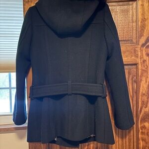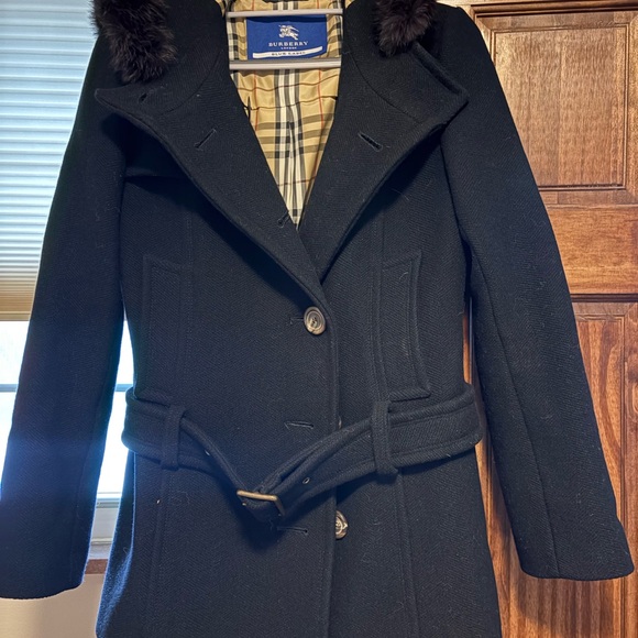 Elegant black trench coat with luxurious fur collar. Classic Burberry style.
