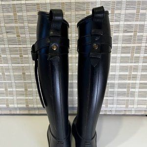 Sleek black rain boots. Durable and stylish. Perfect for winter weather.