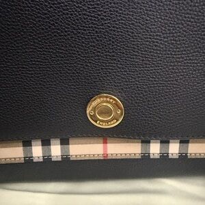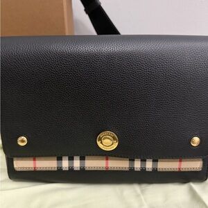 Elegant Burberry crossbody bag in black. Features classic check pattern and gold button detail.
