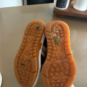 These Burberry boots feature a sleek black knit upper that extends above the ankle, complemented by a distinctive tan and black plaid strap. The design combines modern style with comfort, making them perfect for any occasion.