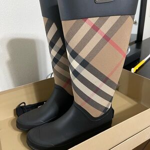 Stylish Burberry boots with iconic plaid pattern. Perfect for winter weather.