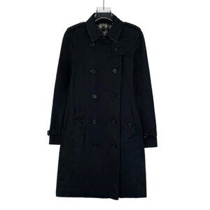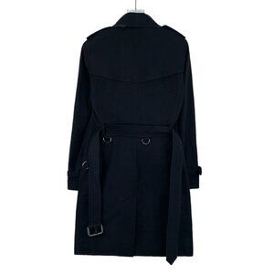 Black cotton double-breasted trench coat with belted waist and long sleeves