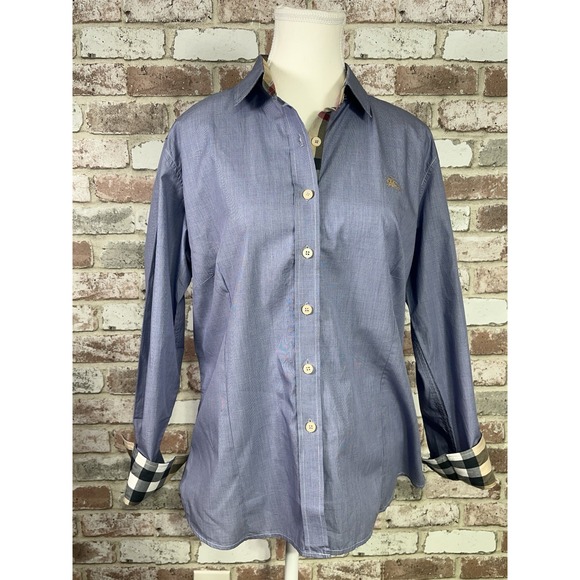 Stylish blue button down shirt. Features iconic Burberry check accents on cuffs and collar. Perfect for casual or formal wear.