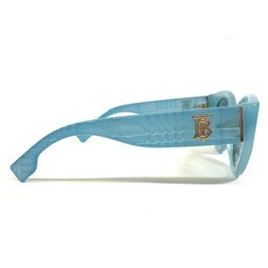 Stylish Burberry sunglasses with a chic cat-eye design. Features a glossy blue frame and matching lenses. Iconic Burberry logo on the side.