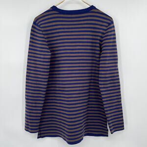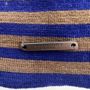 Stylish Burberry sweater with blue and brown stripes. Features decorative embellishments on the neckline. Perfect for a chic look.