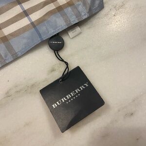 Stylish Burberry scarf with signature plaid pattern. Features blue and tan hues. Timeless elegance. 100% silk with piping.