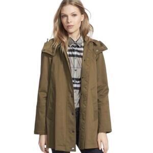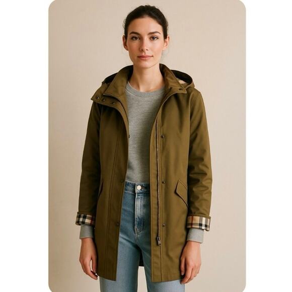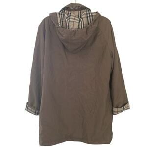 Classic preppy style with Burberry check print on outside collar and sleeves. Some signs of wear including right pocket please see picture. Jacket comes with original wool liner which is removable. Hood is also removable. Coat itself is machine washable but liner is dry clean only.