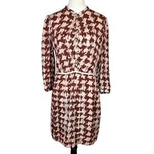 Burberry Brit 12 100% Silk Brown Tan Houndstooth 3/4 Sleeve Button Mini Dress