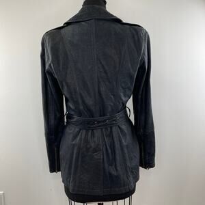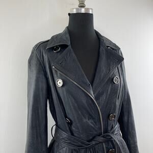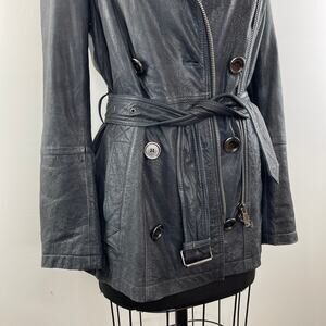 Burberry Brit Dark Blue Distressed Leather Belted Trench Coat Jacket US 6 UK 8