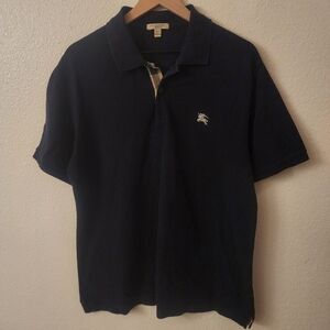 The navy blue has a rich, dark tone, typical of a classic polo shirt, and is complemented by a subtle detail on the collar's underside, which features a lighter checkered pattern (not fully visible but hinted at in the close-up). The overall look is sleek and minimalist, fitting for a brand like Burberry Brit.