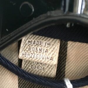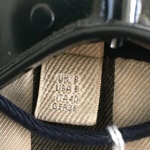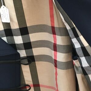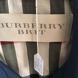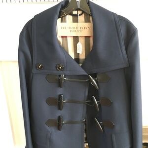 Navy blue updated pea coat. Military style frog closures. Collar will snap closed high. Two lapped pockets. Detail on back. Classic Burberry lining. Wool and cotton blend. Leather accents. Clean. Smoke and pet free. Shows no wear. A classic. Labeled a six but measurements show it will fit like a US 8