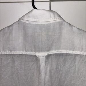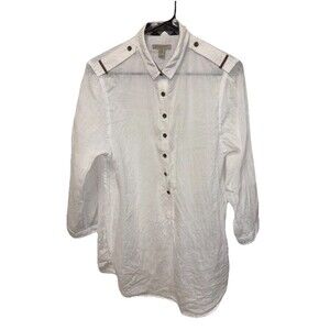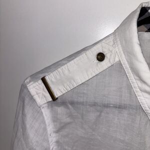 Burberry Brit nova check trim white tunic top pullover point collared 3/4 roll tab sleeve ramie logo buttons machine wash sheer round hemline peasant size XL pit to pit length