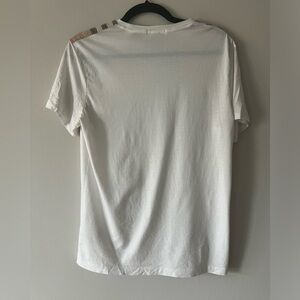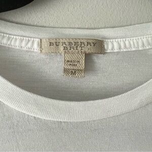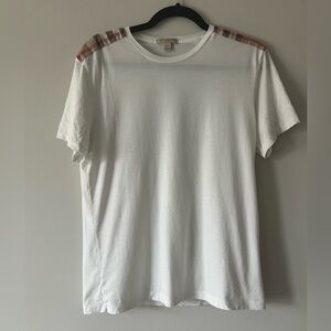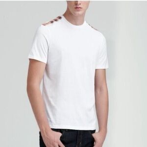 Burberry white tee, Nova check shoulder detail, Burberry Brit shirt, unisex cotton t-shirt, men’s luxury basics, designer casual wear, signature plaid trim, Burberry England style, high-end casual top, soft cotton knit tee, gender-neutral luxury, minimalist streetwear, British heritage brand, tailored fit shirt, Burberry check accent, classic everyday luxury, designer layering piece, upscale fashion essential, neutral wardrobe staple, premium white t-shirt