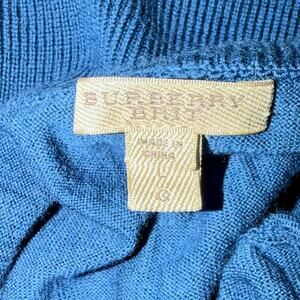 Burberry Brit women’s quarter zip sweater in blue wool with signature Burberry check elbow patches. 100% wool knit, mock neck with zipper, long sleeves, and ribbed trim. Classic, refined style with subtle designer detailing.