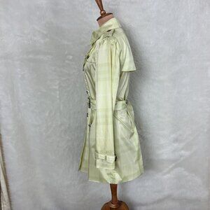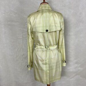 This is a yellow plaid, double breasted, lightweight, mesh lined, belted, button up trench coat jacket from Burberry Brit. 100% polyester outer. Tags are attached to the packing bag. ( I put it inside the jacket pocket). NWT, bnwt, brand new with tags. No flaws. For reference the mannequin is a size 6-8 with measurements of: 34 in 26 in 35 in.
