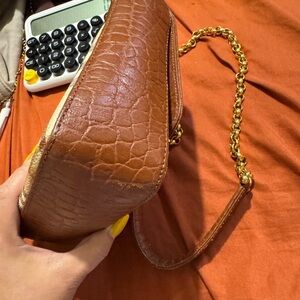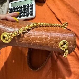Elegant brown leather crossbody bag featuring a stylish gold chain. Perfect for any occasion.