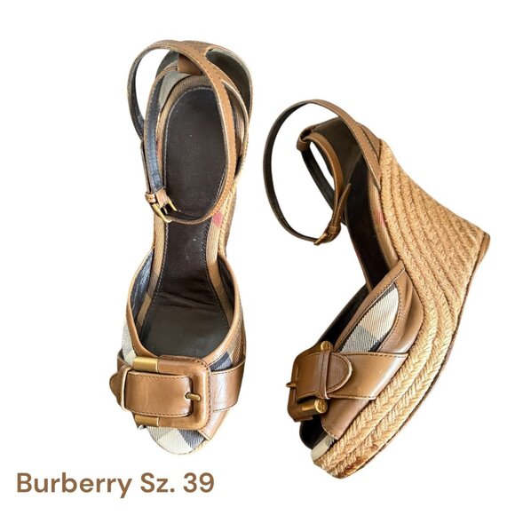 These Burberry espadrille wedge sandals combine sophistication and casual charm. Crafted with brown leather and iconic Novacheck canvas, they feature a chic buckle detail and peep toe design. The 4-inch woven wedge heel adds height with comfort, making them a versatile addition to any wardrobe.