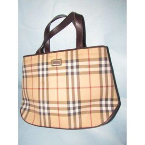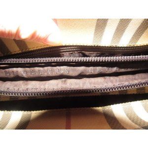 The bag is a double strap, satchel shoulder purse by Burberry of London. It is made from 'Nova Check' (please tell me if this is wrong), brown/red/white/black plaid print in heavy canvas fabric & brown leather. It has a top zip closure with 2 leather handheld straps and a hard, curved, footed leather bottom. The hardware is pewter/chrome. It has three large compartments and several interior pockets to keep you organized.