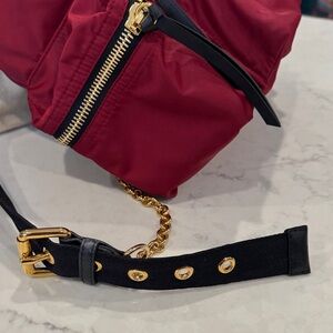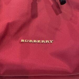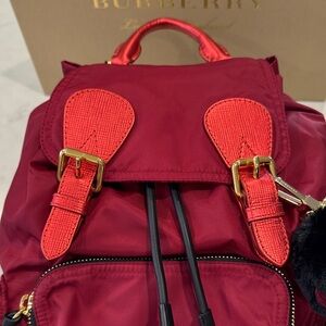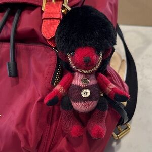 Elegant Burberry backpack in rich burgundy. Features gold hardware and a charming teddy bear keychain.