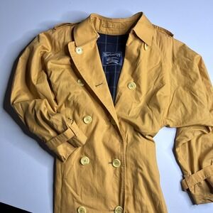 Classic Burberry trench with attached hood. Drawstring waist for shape. Snap-front closure and flap pockets. Lightweight, versatile outer layer. Approximately 33 inches from shoulder to hem.