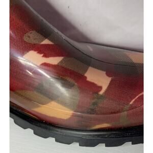 The product is a pair of Burberry Burgundy Tan Graffiti Heart Talk Rain Boots in size EU38 US 7.5-8. These boots are designed specifically for women and feature a multicolor graffiti heart talk design, adding a playful and unique touch to the classic rain boot style. Made with rubber as the upper material, these boots are both stylish and durable, perfect for rainy days or casual outings. The Burberry brand ensures both quality and fashion-forward design in this statement footwear piece.