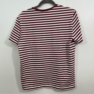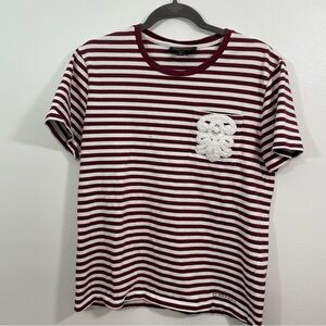 Casual short sleeve tee with bold stripes. Features a unique embroidered pocket. Ideal for everyday wear. Small snag on front (pictured)