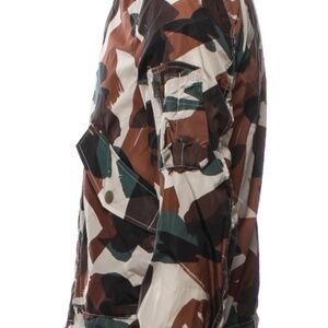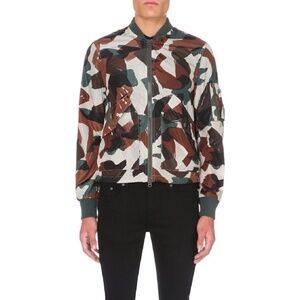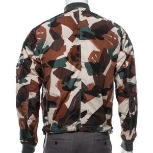 Men's green, brown and multicolor lightweight nylon bomber jacket with abstract camouflage print throughout, dual flap pockets at front, single zip pocket at sleeve, rib knit trim throughout, contrast stitching throughout, tonal interior and zip closure at front.