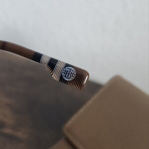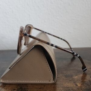 New condition with original box, dust bag, hard case, care booklet, and dust cloth. Translucent peach frames and nova check pattern arms.