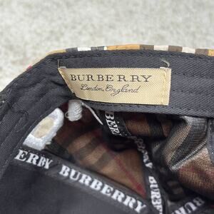Burberry check print baseball cap featuring classic tan Nova-style plaid with bold BURBERRY lettering across the front and solid white brim. Adjustable back strap for a custom fit. Interior Burberry London England tag inside. Perfect designer streetwear piece to pair with casual or luxury outfits. Hat only, no box or dust bag included. Please review photos for fit and condition before purchasing.