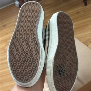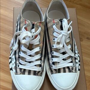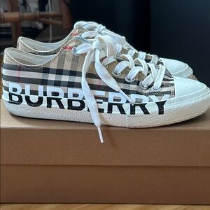 Chic Burberry sneakers with iconic check pattern. Features bold black branding and white laces.