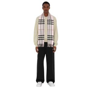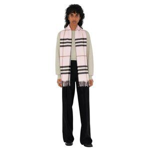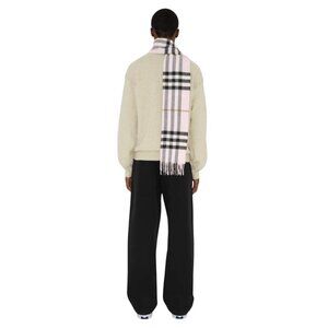 Indulge in timeless elegance with this Burberry cashmere scarf in pale candy pink. Perfect for elevating your style, it offers both warmth and sophistication. A versatile accessory for any wardrobe.