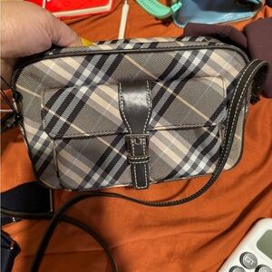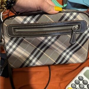 Stylish Burberry crossbody bag featuring a classic checkered pattern. Perfect for everyday use with its sleek black and tan design.