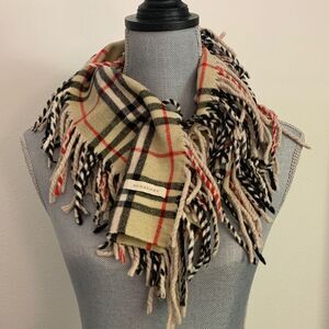 Elegant Burberry scarf featuring a checkered pattern and double sided fringe accents. Showcases black, red, and light green tones.