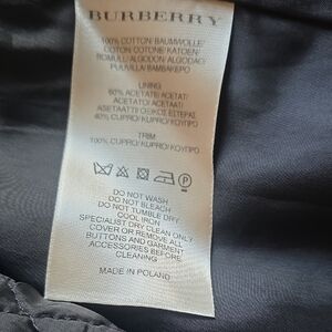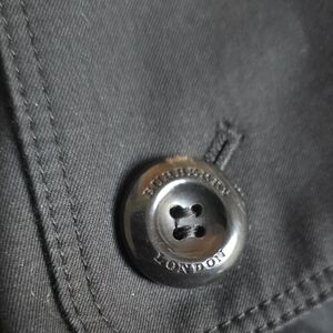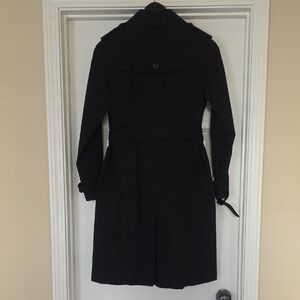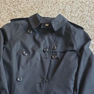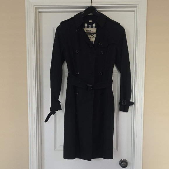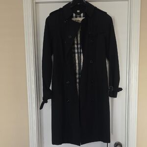 Elegant black trench coat with double-breasted design. Features a matching belt and buttoned cuffs. Removable lining that is reversible for the classic Burberry pattern or solid black.