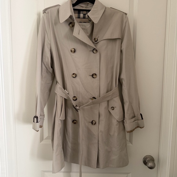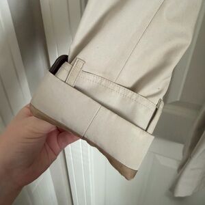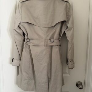 Elevate your style with this classic beige trench coat. Perfect for any occasion, this coat offers both elegance and functionality. Signs of wear and makeup around neckline. Could use a quick trip to dry cleaner!