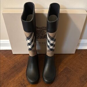 Stylish Burberry rain boots with iconic house check plaid design. Features black and tan colors.