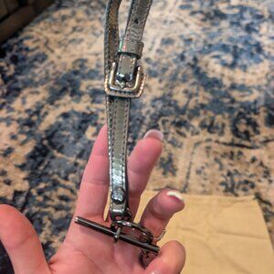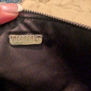 Looks brand new, no signs of wear. The bag measures approx: 12"W(at the widest) X 5" H . Detachable wrist strap and comes with dust bag. handkerchief is 18x18