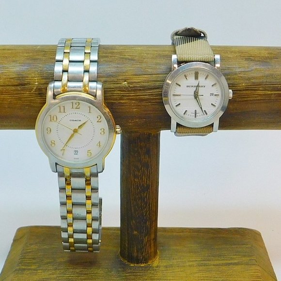 Markings: BURBERRY, SWISS MADE, FIVE 5 JEWELS, BU1387, 50M/165 FEET, 15123, OPI, 33 09 08, A, COACH, SWISS, 0802, 6.801.590, STAINLESS STEEL, WATER RESISTANT, 3 ATM