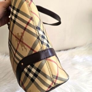 This Burberry tote bag in cream and brown offers a sophisticated and timeless look. Its structured design makes it perfect for everyday use, while the durable materials ensure longevity. The elegant color combination adds a touch of luxury to any outfit.