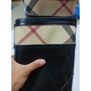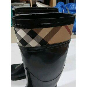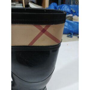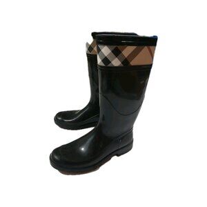 Burberry Crosshill Rainboots. Size 41/10. Black with the Burberry check pattern on the top. Pull on. In nice, preowned condition. Wear to inside of left boot as shown. Minor wear to bottoms.