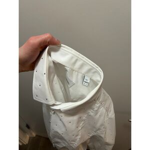 -White base color with crystal like embellishments and buttons. secured branded sleeves.