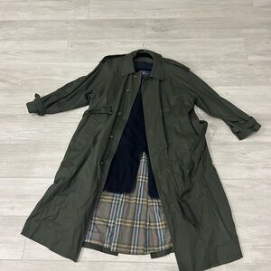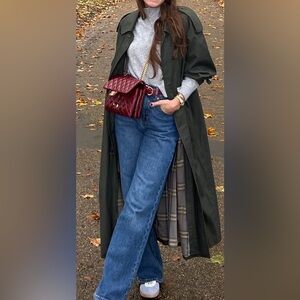 Burberry dark green trench coat.. Styled to be oversized — doesn’t have a tag sized on it but I am usually a small this was perfect with jacket or sweater under the trench or for a more oversized fit.