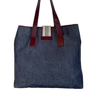 Elevate your style with this stunning Burberry tote bag! This unique piece features the classic elegance of burgundy leather with the casual cool of denim, and striped canvas snap closure. In