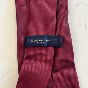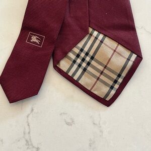 Sophisticated Burberry tie in deep red. Features iconic check pattern detail. Ideal for formal events.