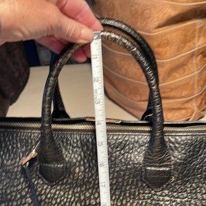 This stylish tote is beautifully crafted of richly grained calfskin leather in black with a fade to gold. The shoulder bag features a rolled leather top handle with an optional shoulder strap and a polished broad brass zipper opening.