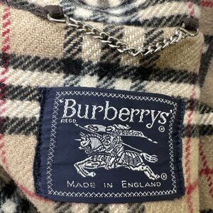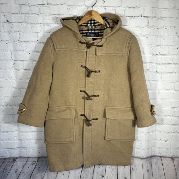 The Burberry Duffle Toggle Coat Jacket in size M is a stylish and classic mid-length coat made of wool with a check pattern lining. This hooded jacket features a toggle closure and is perfect for various occasions such as travel, parties, casual outings, and formal events. The tan color and vintage design add a touch of London elegance to any outfit. With its classic Burberry style and designer appeal, this coat is a must-have for the winter, fall, and spring seasons.